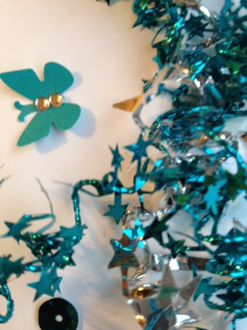 I used some sparkly garland and twisted it around a chop stick . I hot glued it to card added sequins and a tiny butterfly.